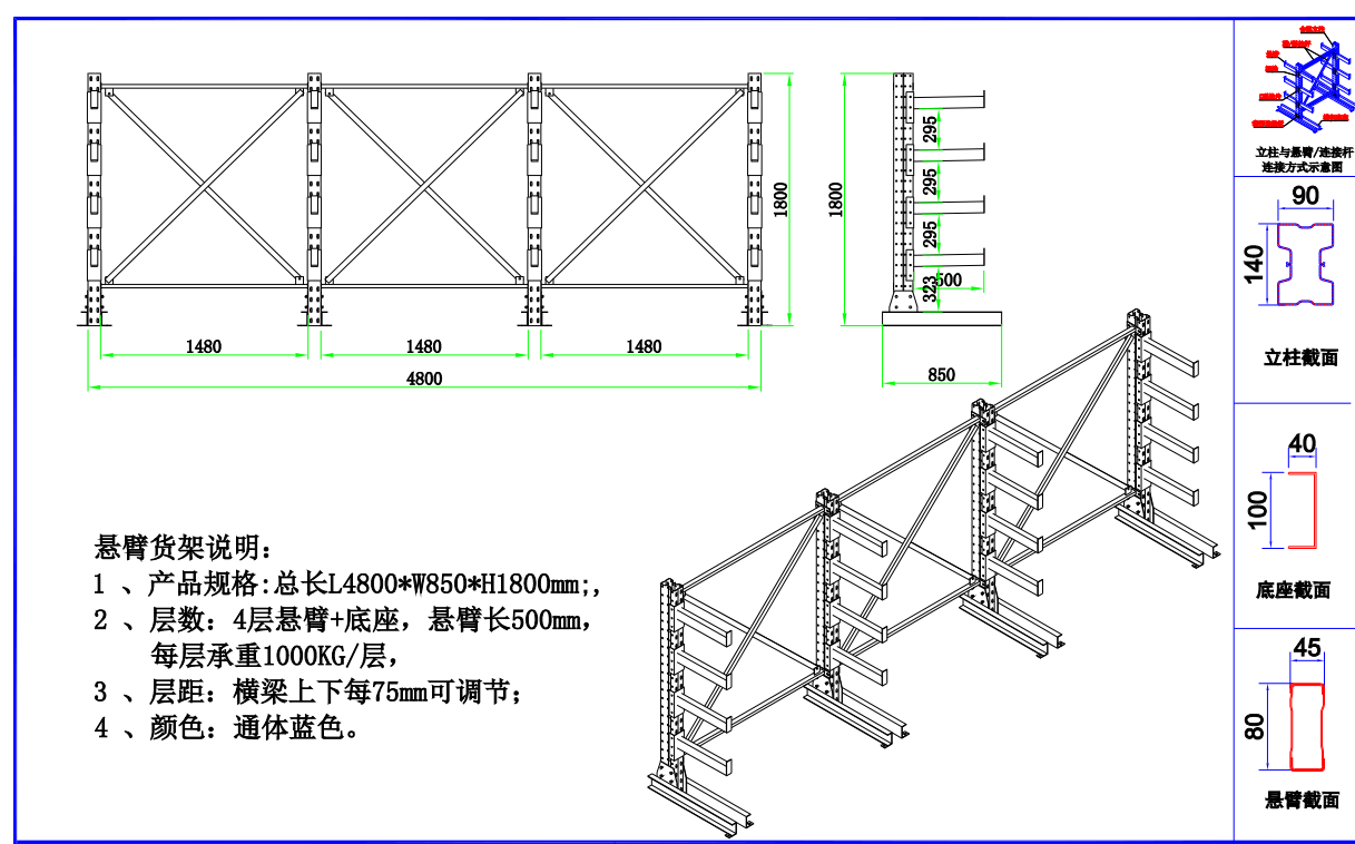 懸臂貨架說明:規(guī)格L4800*W850*H1800 層數(shù) 4層懸臂+底坐,懸臂長500. 每層承重1000KG/層,層間距:橫梁上下每75mm可調(diào)節(jié) 顏色:通體藍色